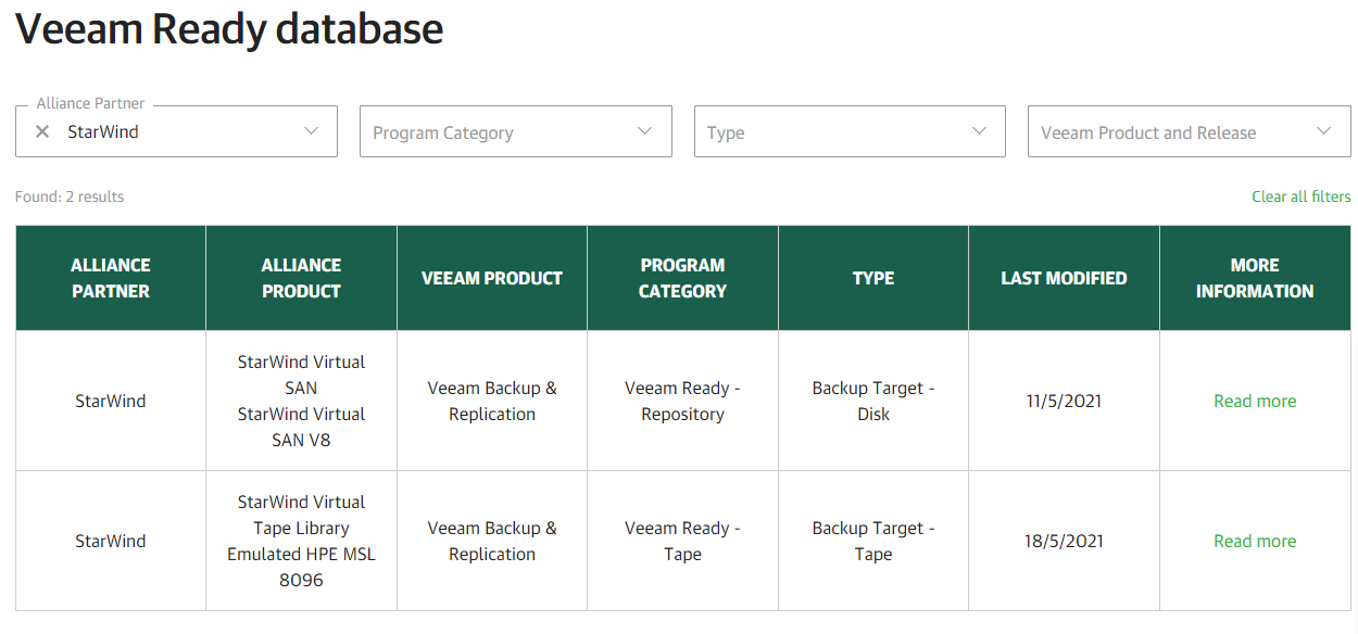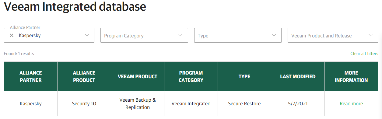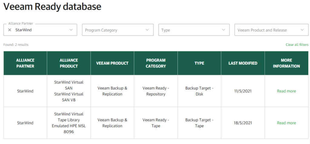 Конечные заказчики легко и быстро могут узнать результат проверок на странице Veeam Alliance Technical Programs (переключайтесь между Veeam Ready и Veeam Integrated, пролистывайте примерно один экран до таблицы с фильтрами).